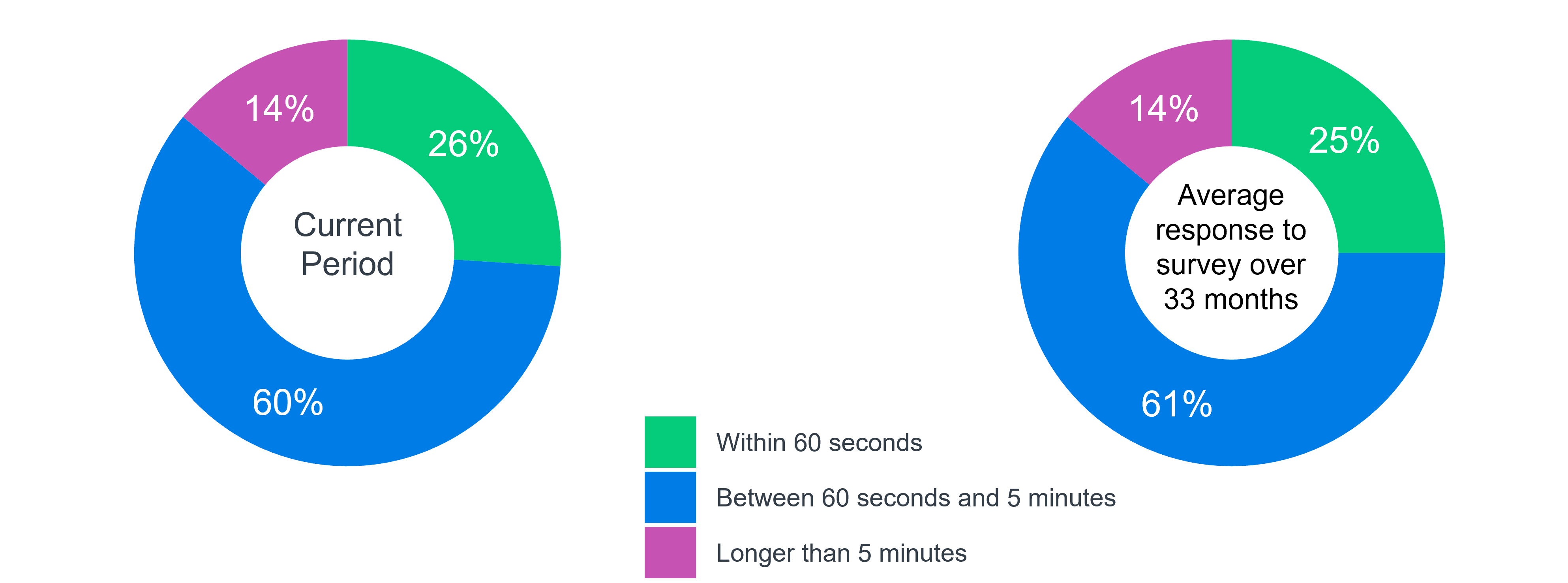 In November 2022, enterprises were most likely to take between 60 seconds and 5 minutes to initiate DDoS mitigation, in line with previous reporting periods.