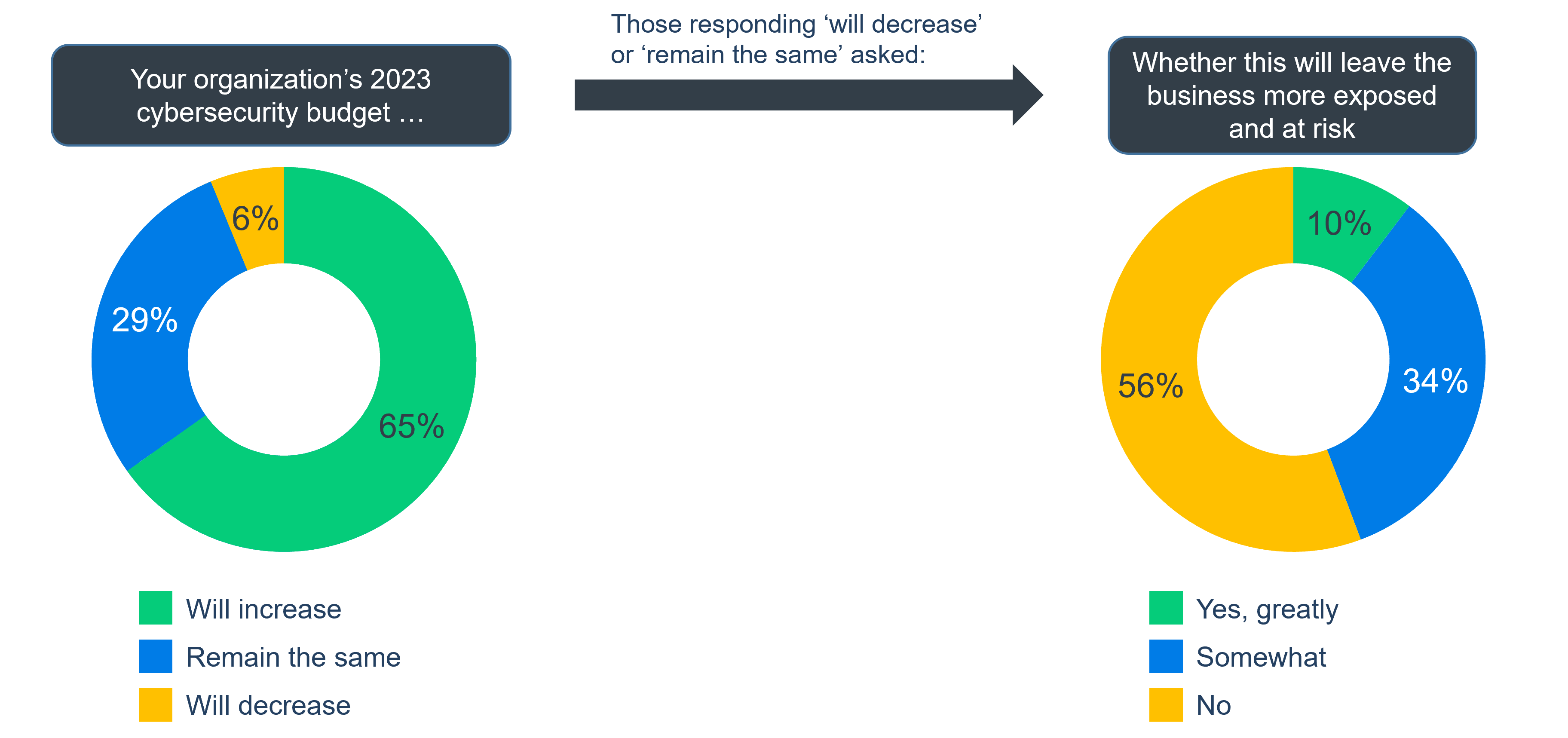 A third (35%) of organizations will see their 2023 cybersecurity budget remain the same or decrease and 44% of these believe this will leave their business more exposed and at risk to some degree.