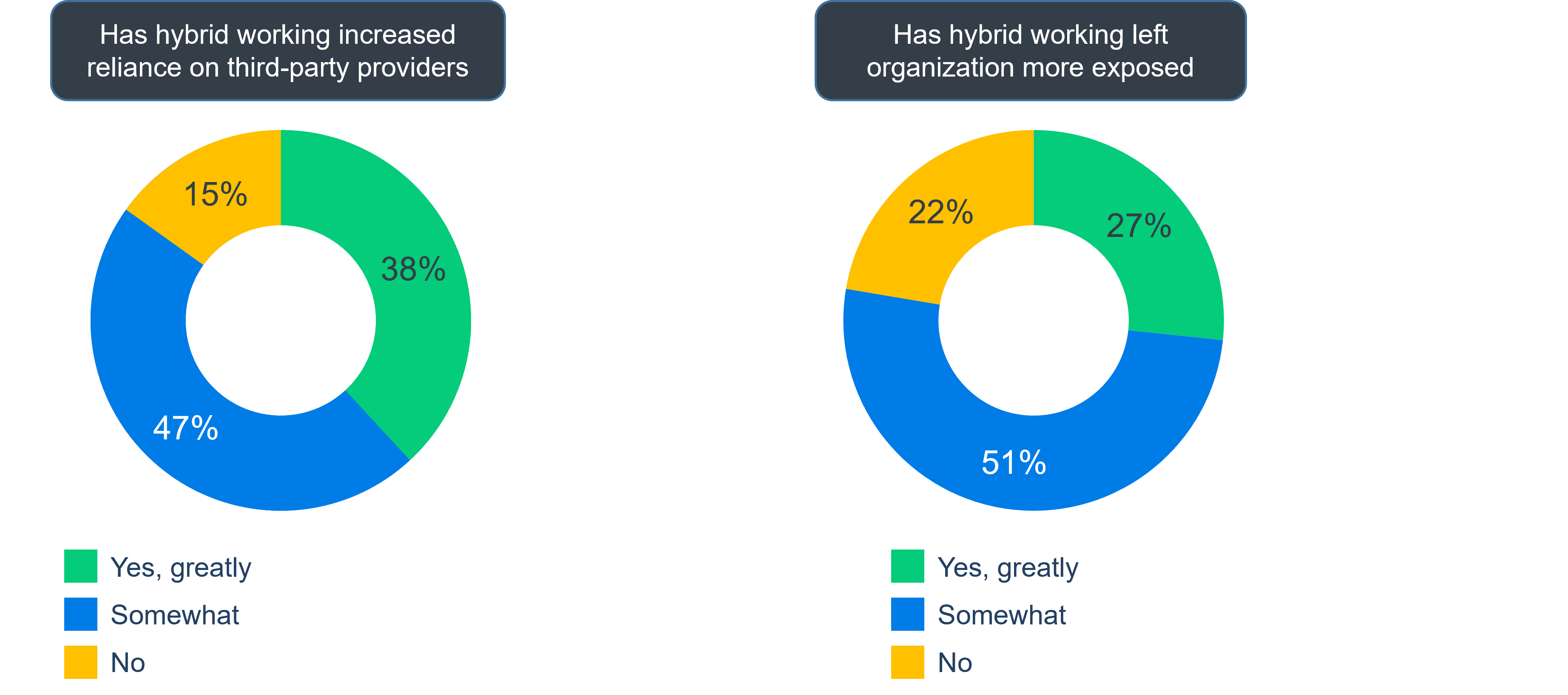 The majority (85%) believe hybrid working has increased reliance on third-party providers for outsourcing staff and resources, and a majority (78%) believe this has left their organization more exposed.