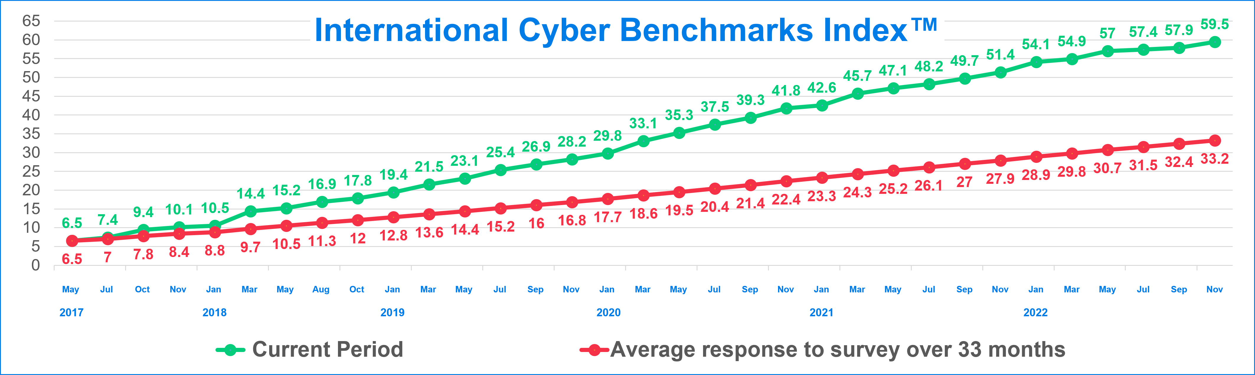 The latest International Cyber Benchmarks Index™, for November 2022, is 59.5, maintaining the upward trend.