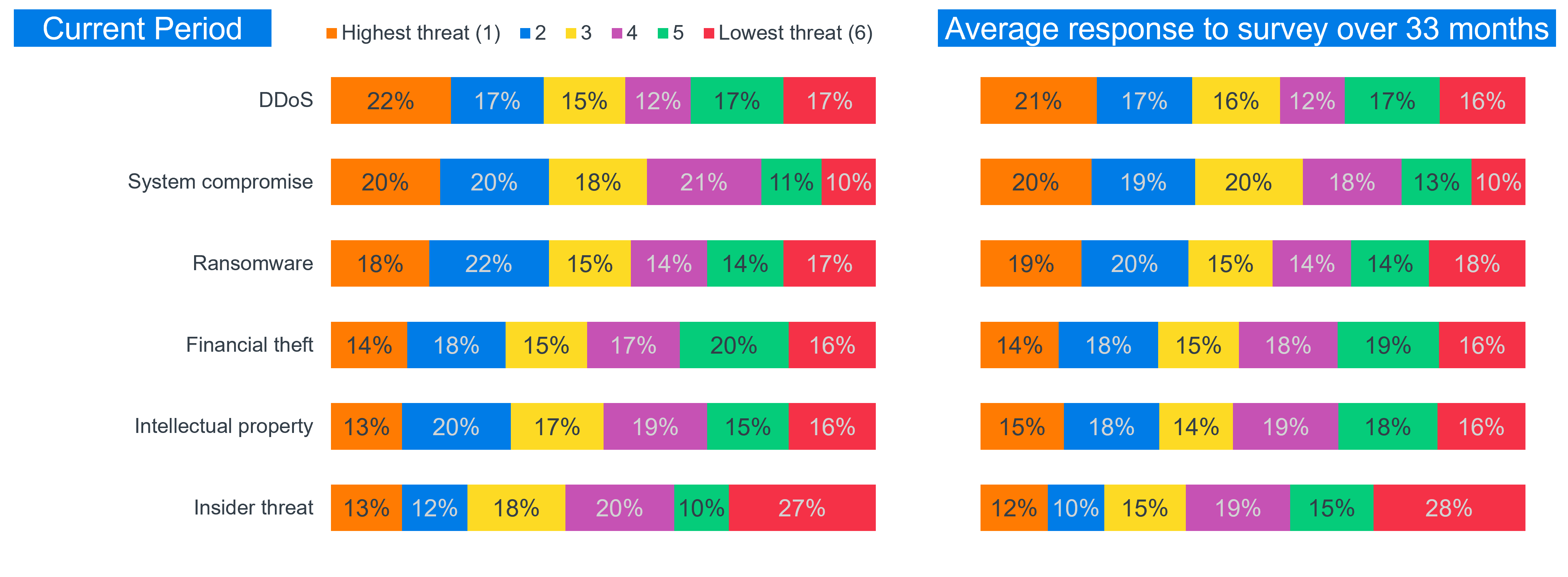 During September-October 2022, DDoS was the greatest concern followed by System Compromise and then Ransomware.