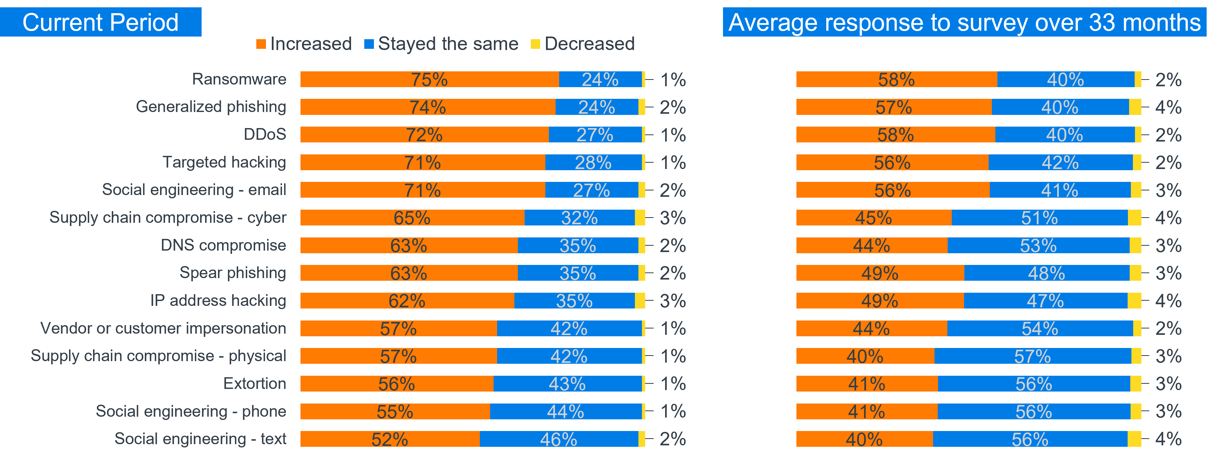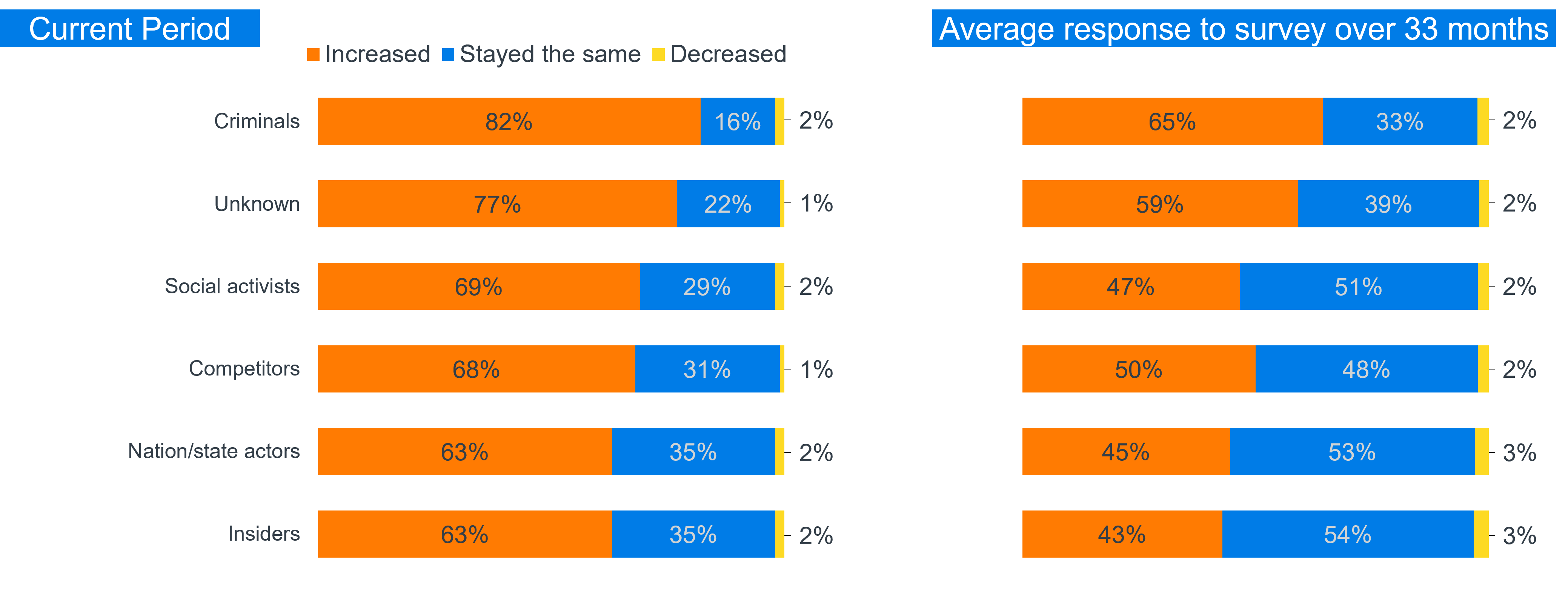 During September-October 2022, organisations have perceived the most likely increase in threats to be from Criminals and Unknown actors.
