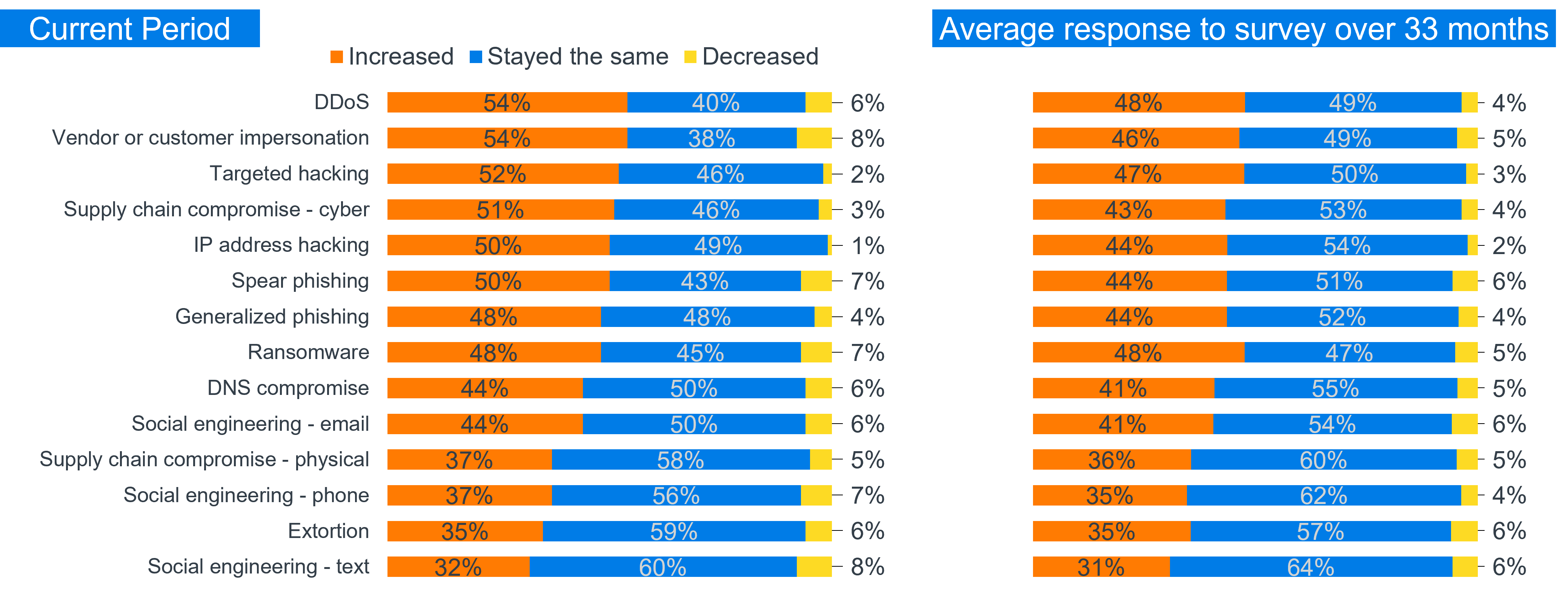 During September-October 2022, organisations have focused most on increasing their ability to respond to DDoS, Vendor or customer impersonation and Targeted hacking.