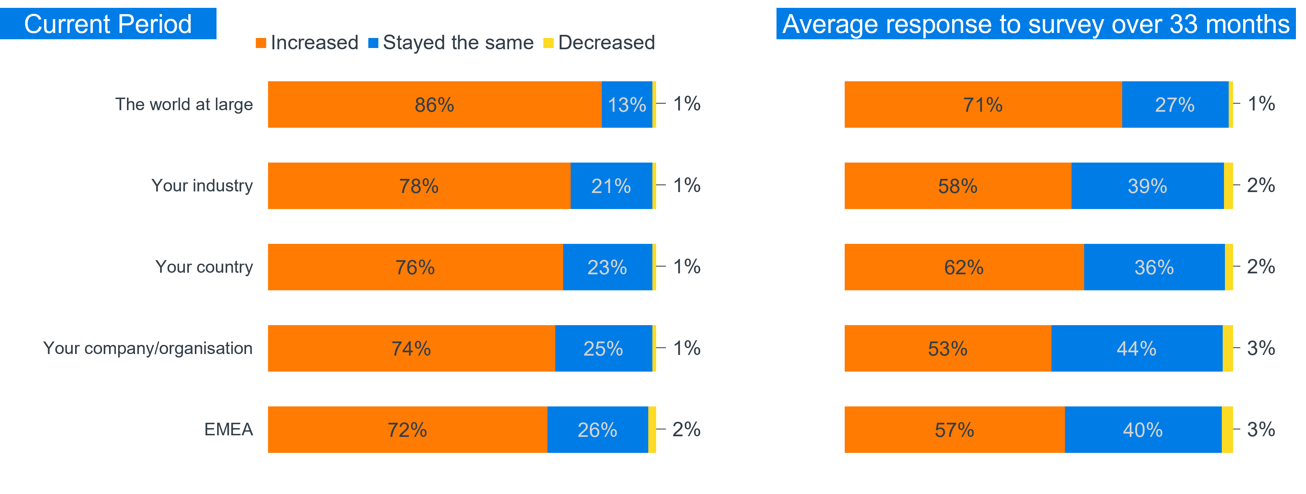 During September-October 2022, organisations have continued to perceive the threat landscape to be increasing most from the World at large and least from EMEA.