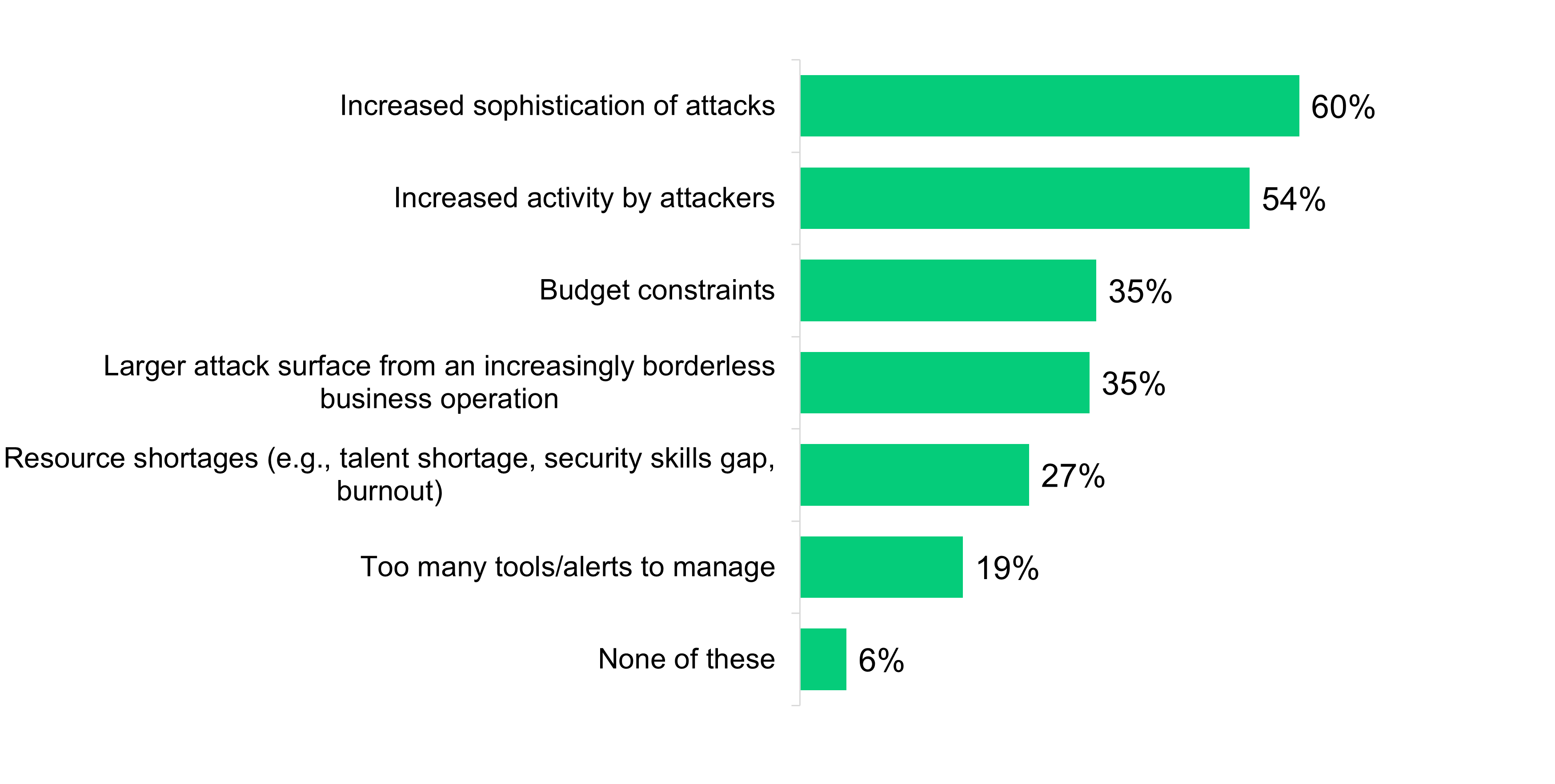 The biggest current risks to IT security posture are ‘increased sophistication of attacks’ and ‘increased activity of attackers’. ‘Budget constraints’ also feed into this concern.